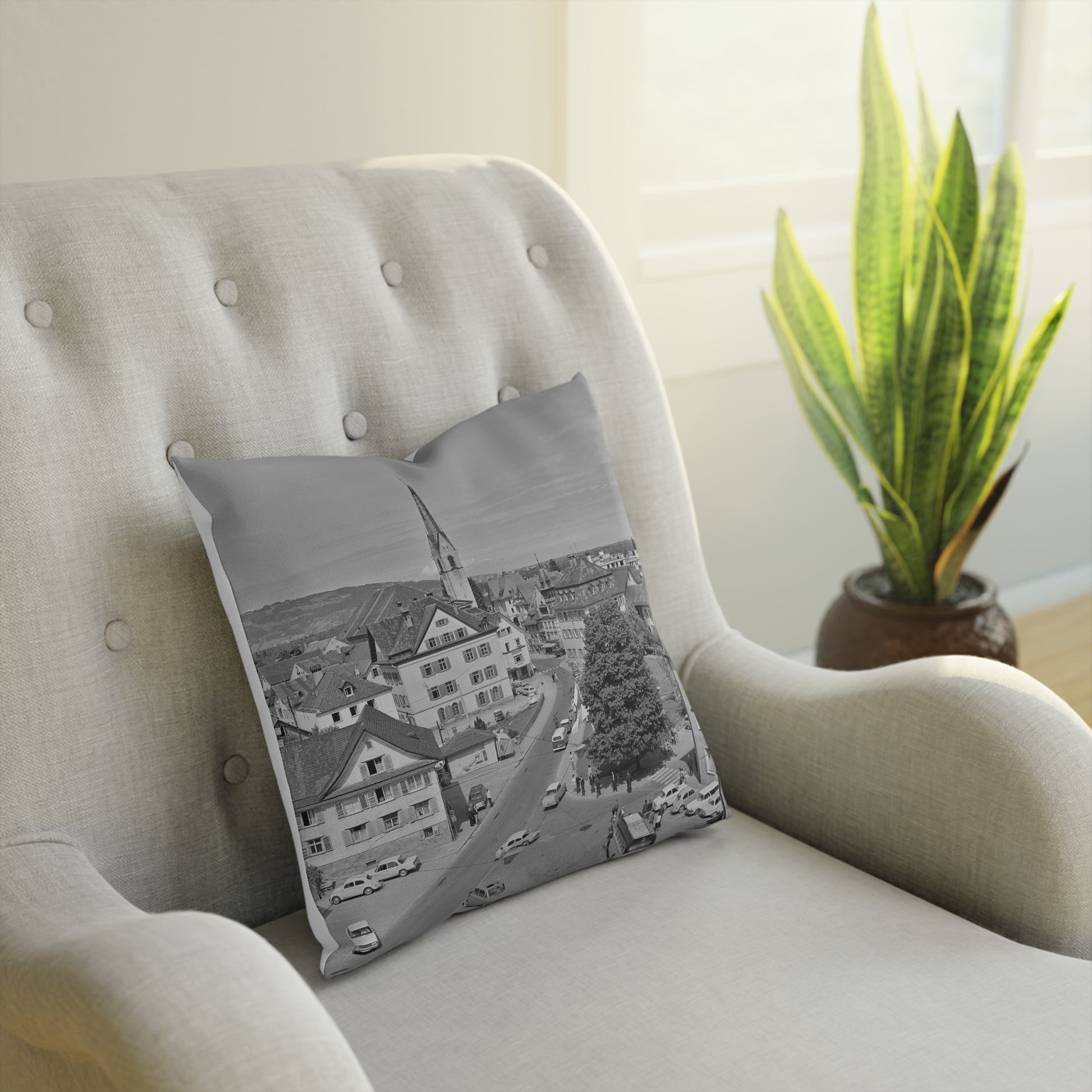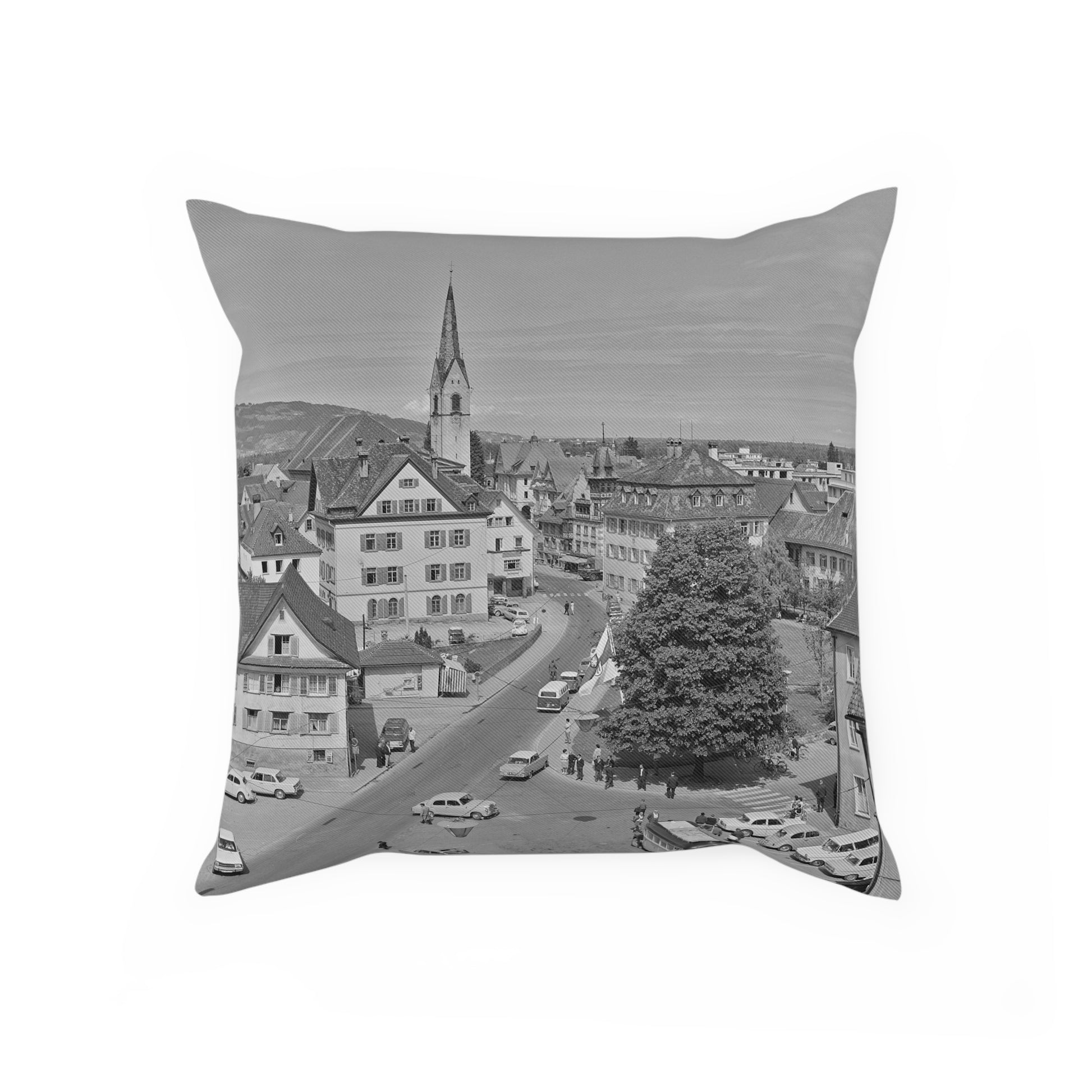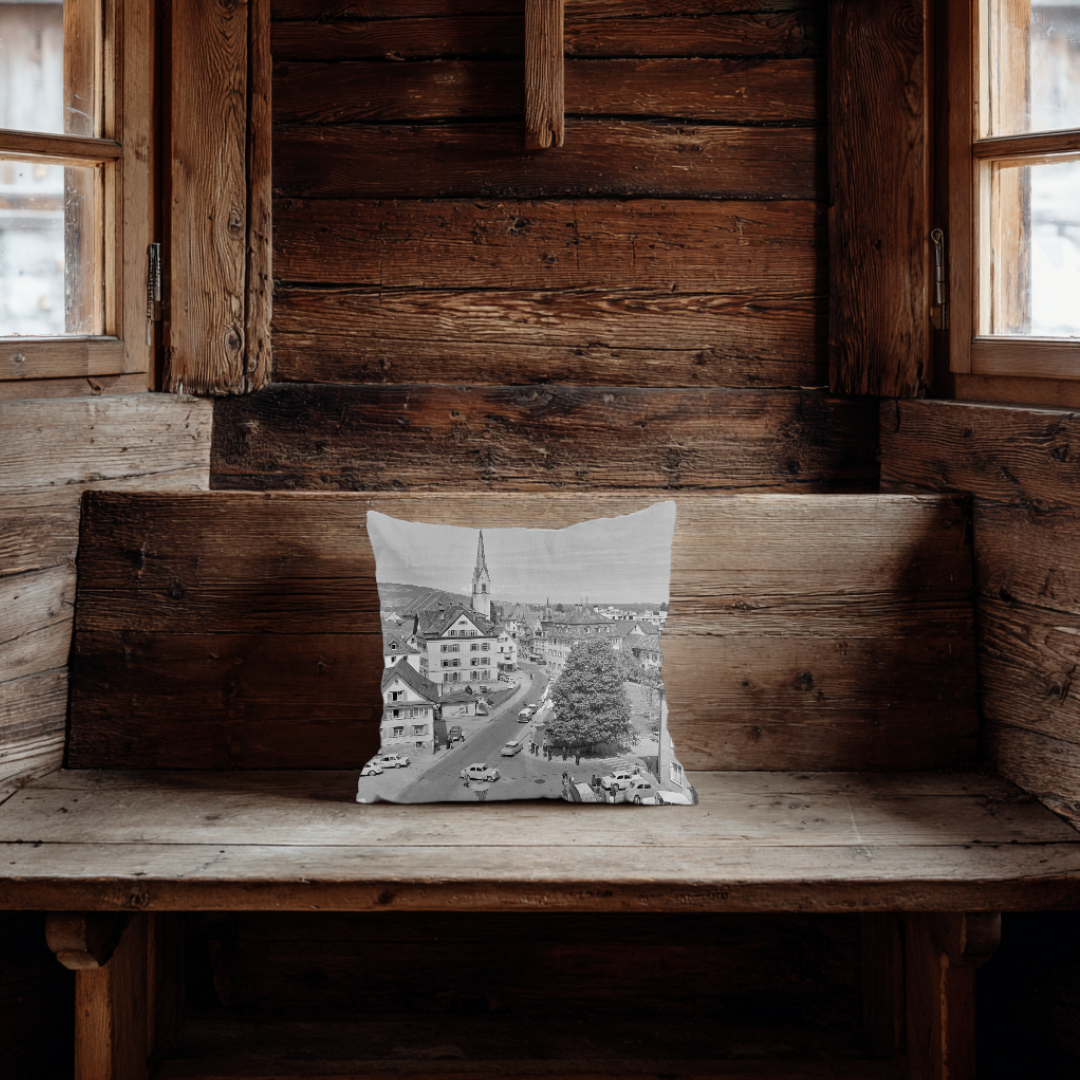 Dieses Kissen zeigt eine lebendige Ansicht der Dornbirner Marktstraße mit ihren charakteristischen historischen Gebäuden, der markanten Kirchturmspitze und dem offenen Straßenraum, in dem Alltag und Bewegung sichtbar werden. Die Perspektive von oben verleiht dem Motiv Tiefe und lässt das Stadtbild bis in die Ferne wirken. Ein detailreiches, urbanes Zeitdokument, das sowohl Tradition als auch städtisches Leben harmonisch vereint und jedem Raum eine besondere, lokale Note verleiht.