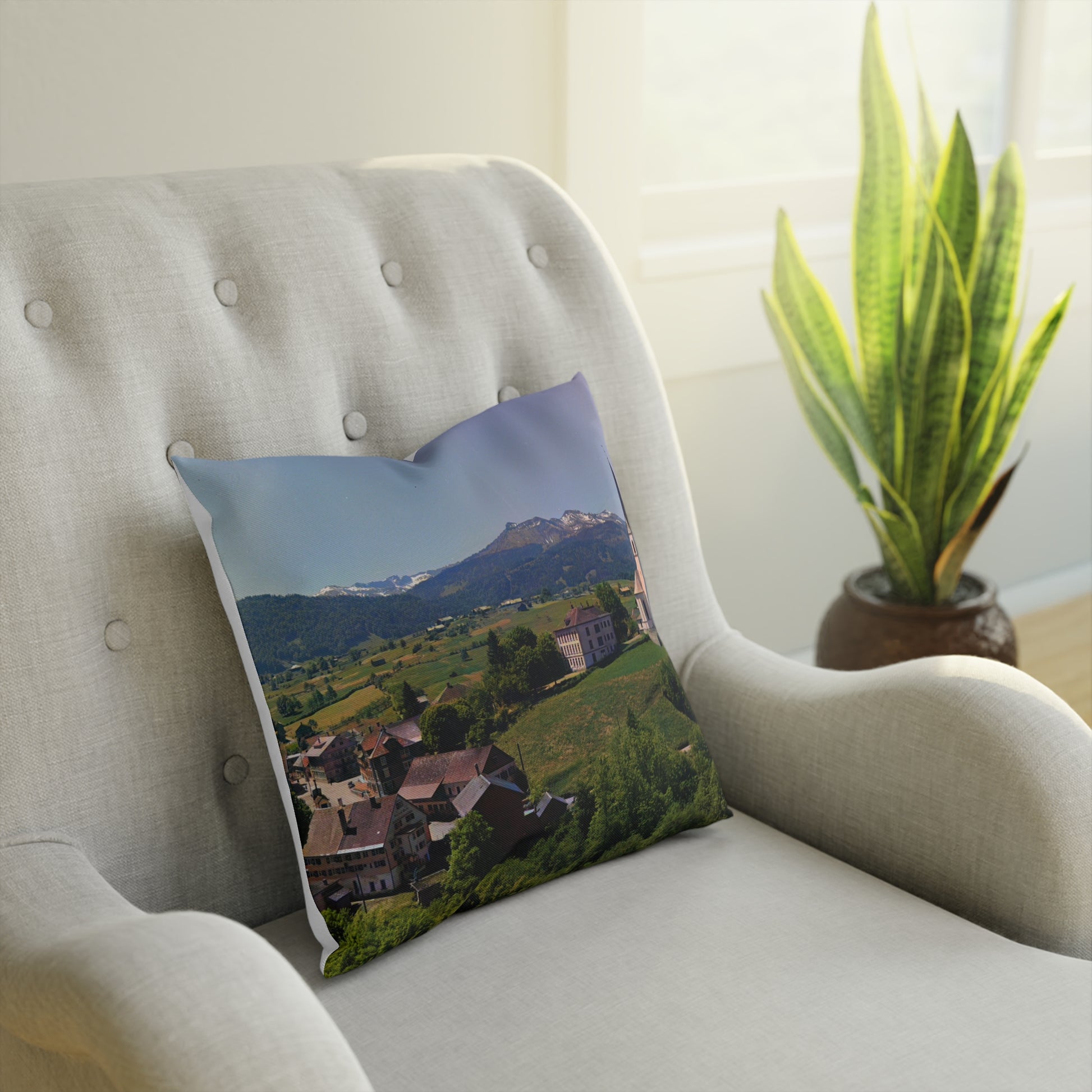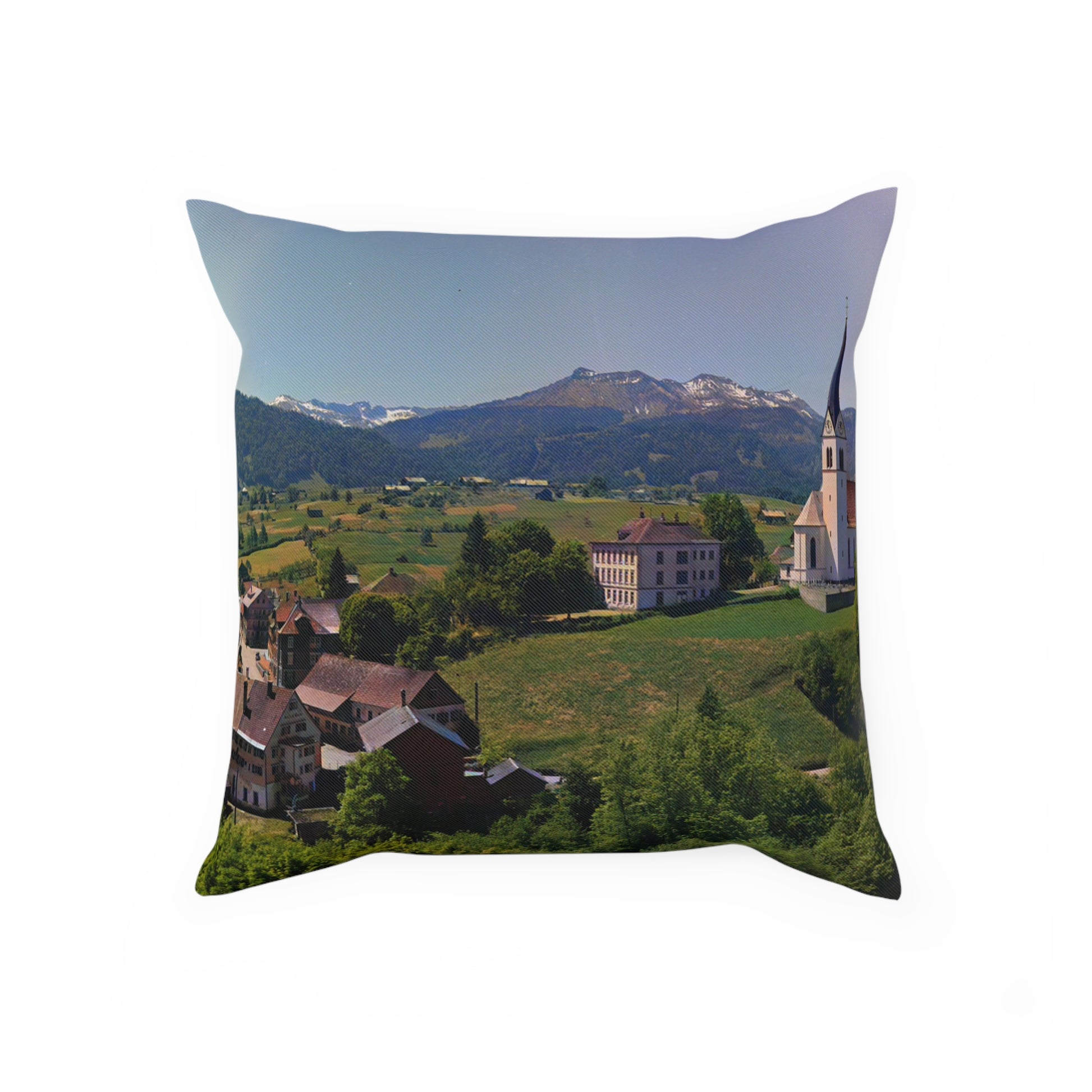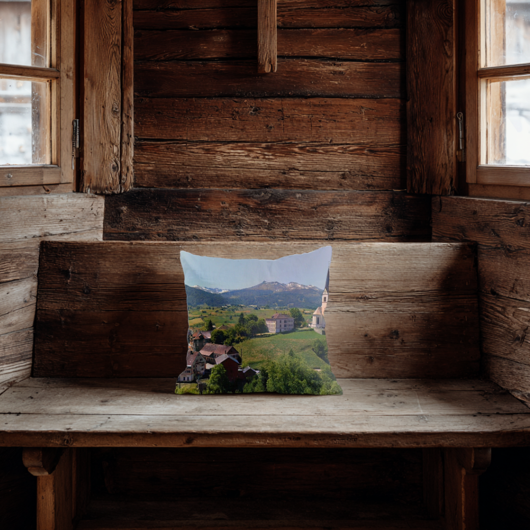 Dieses Kissen zeigt Egg mit der Kirche als markantem Mittelpunkt und dem umliegenden Dorf, klar und übersichtlich aus einer erhöhten Position aufgenommen. Die weite Sicht auf die Häusergruppen und die dahinterliegenden Höhenzüge verleiht dem Motiv eine offene, klare Wirkung. Ein ruhiger, authentischer Blick auf den Ort, so wie man ihn kennt.