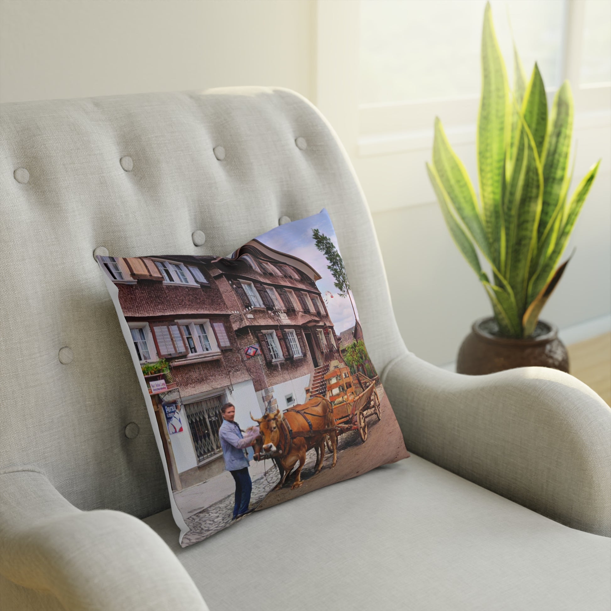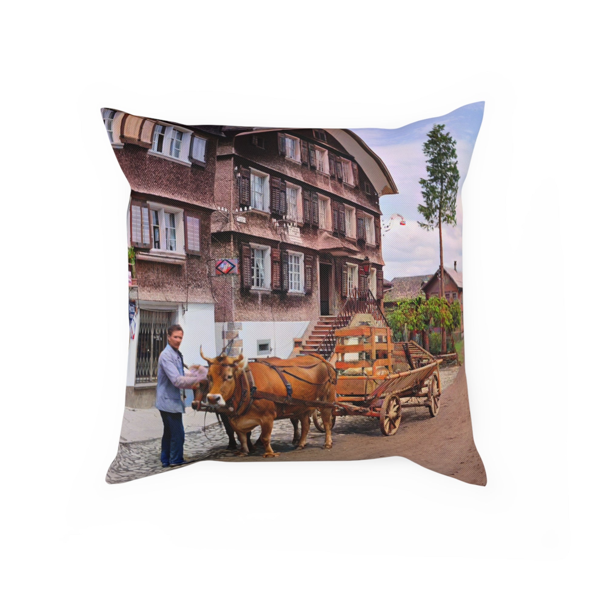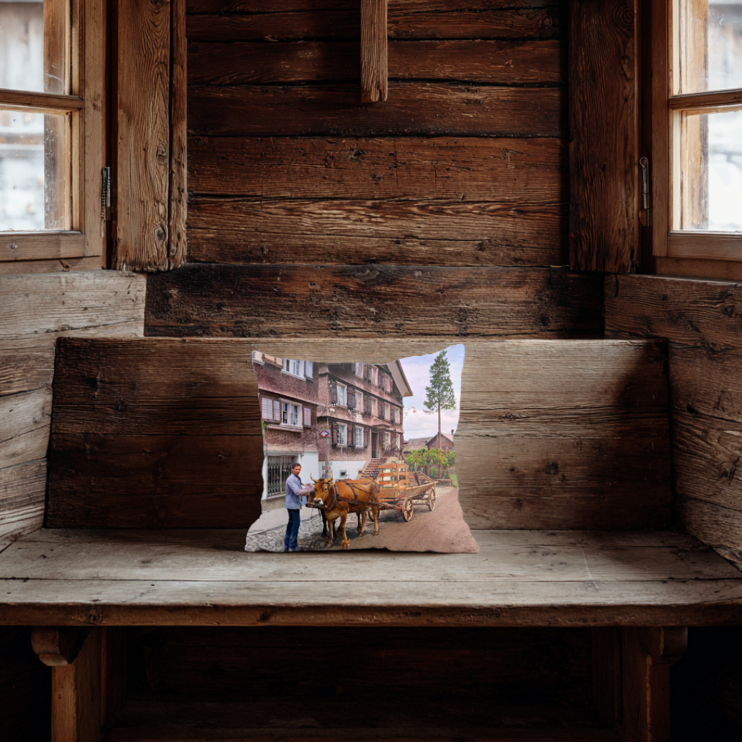 Dieses Kissen zeigt ein Fuhrwerk in Schwarzenberg: Ein Mann steht neben der Kuh, die den Wagen zieht, und die Szene spielt sich direkt vor einem typischen Wälderhaus ab. Der gepflasterte Straßenabschnitt, der Wagen und die ruhige Dorfumgebung verleihen dem Bild einen klaren, bodenständigen Charakter. Eine Aufnahme, die den früheren Alltag im Dorf treffend einfängt, ohne überladen zu wirken.