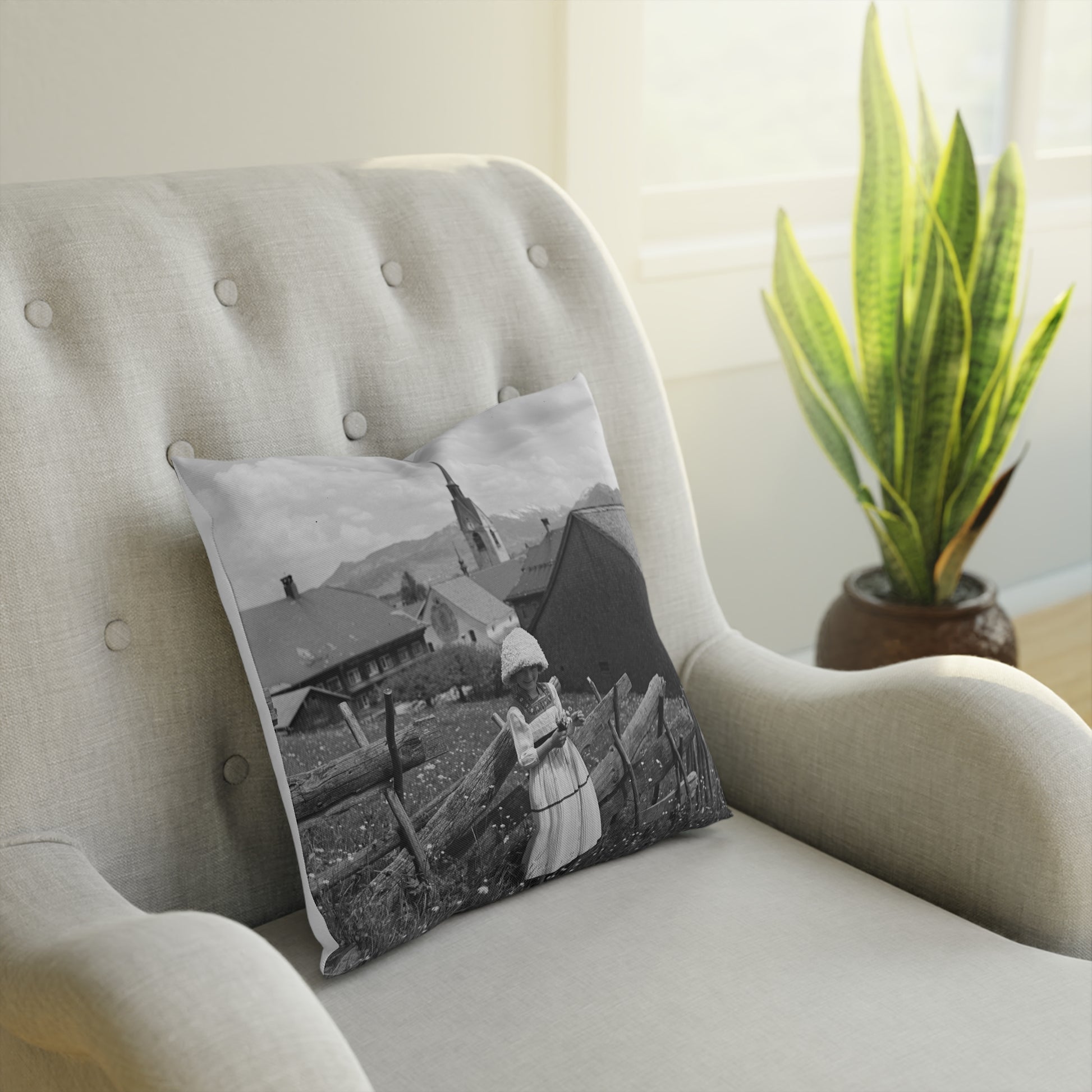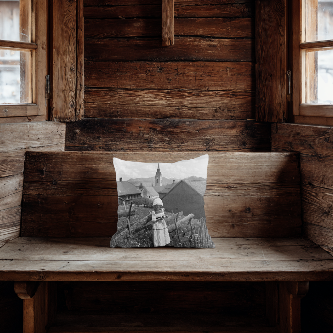Dieses Kissen zeigt Ilse Beer (Tochter von Franz Beer) in Bregenzerwälder Tracht auf einer Wiese in Schwarzenberg. Die Aufnahme wirkt leicht und ungestellt: Das Kind steht am alten Holzzaun, hält ein kleines Sträußchen in der Hand, und im Hintergrund sind die Kirche und die Dächer des Dorfes gut zu erkennen. Ein ruhiger, warmer Moment, der den traditionellen Charakter des Bregenzerwaldes sehr stimmig einfängt.