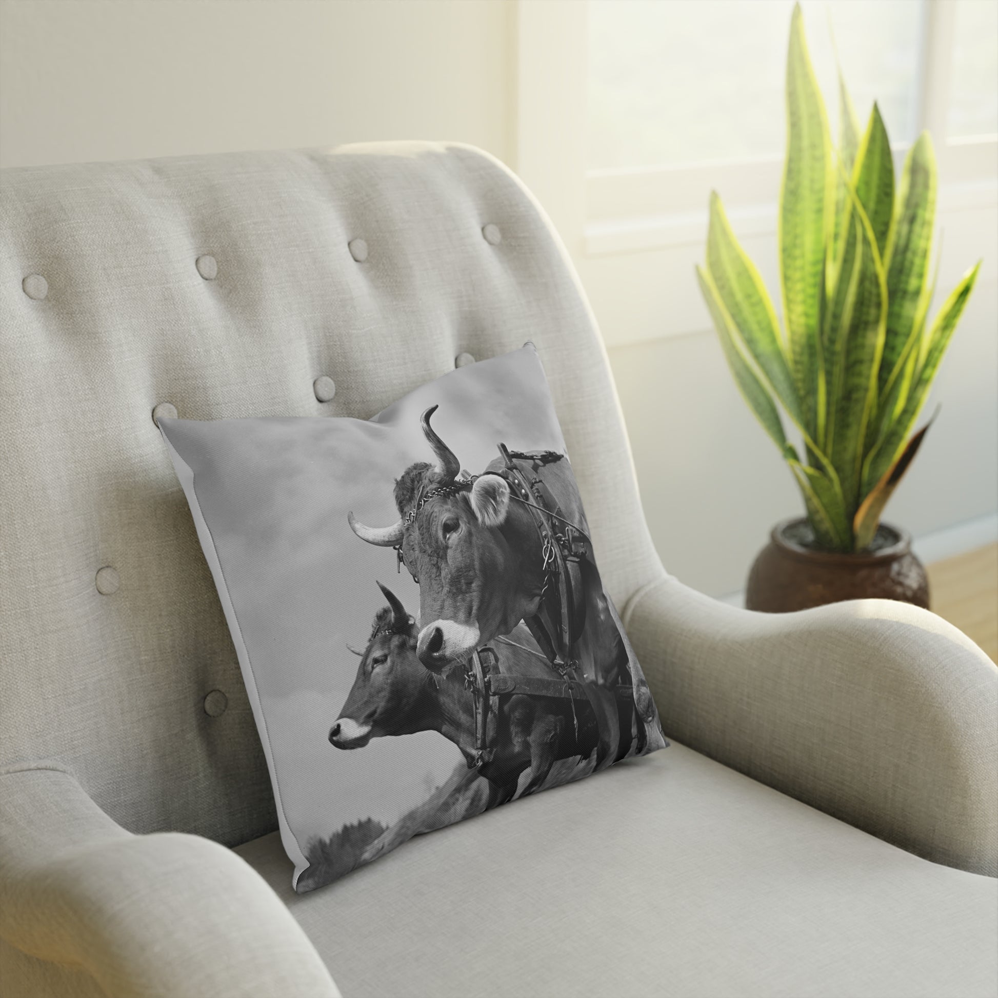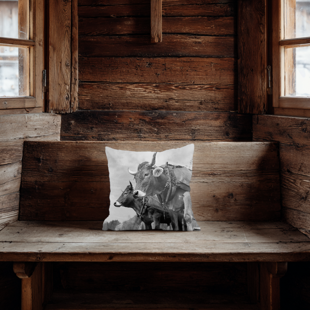 Dieses Kissen zeigt zwei Kühe, die gemeinsam als Teil eines traditionellen Fuhrwerks im Einsatz waren. Die niedrige Perspektive betont ihre ruhige Stärke und verleiht dem Motiv eine besondere Präsenz. Ein authentisches, natürlich wirkendes Bild, das die ländliche Umgebung und die besondere Ausstrahlung der Tiere stimmungsvoll einfängt.