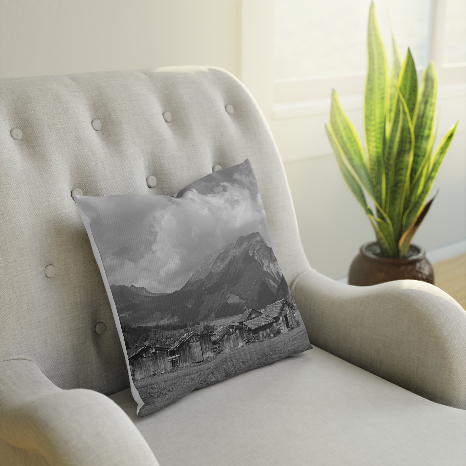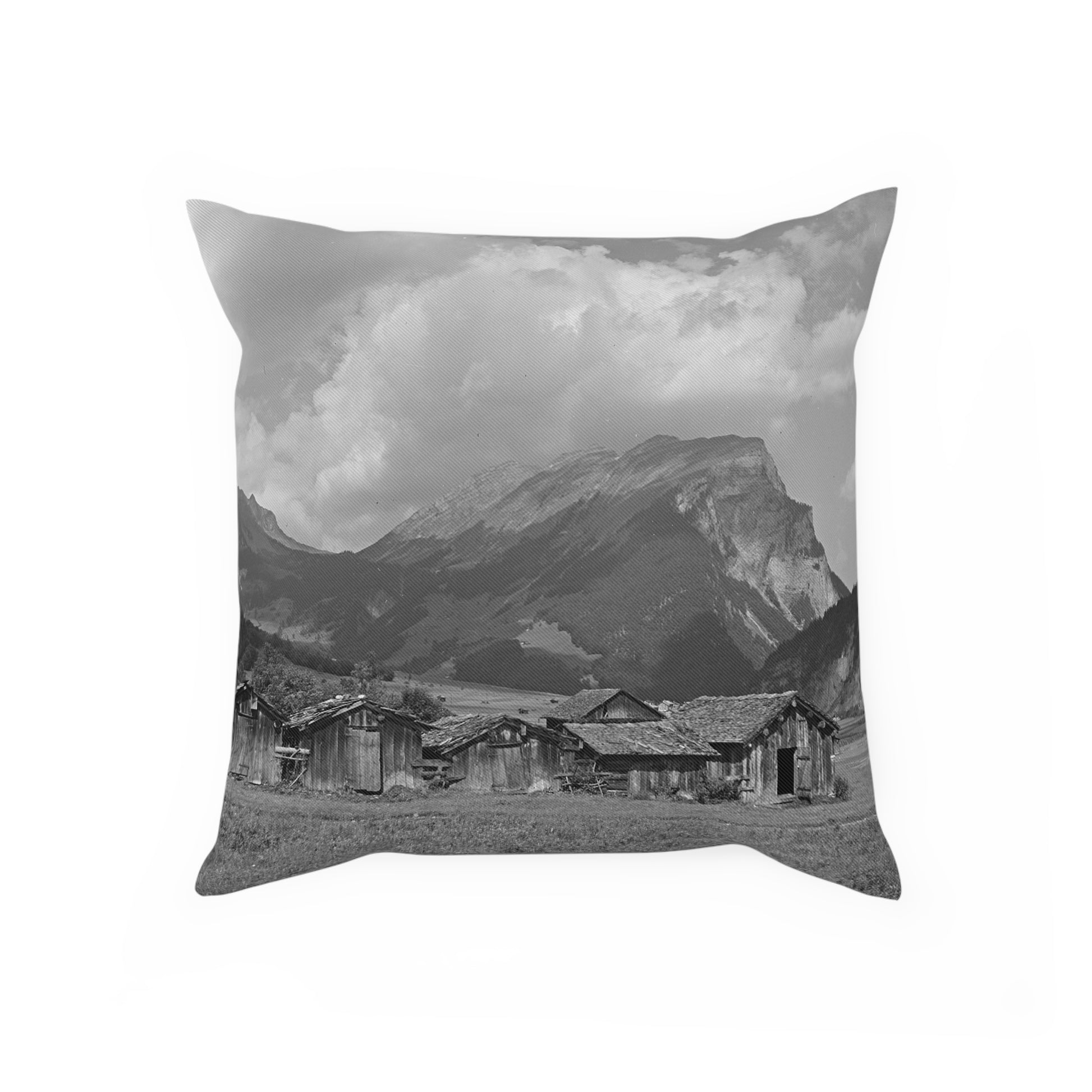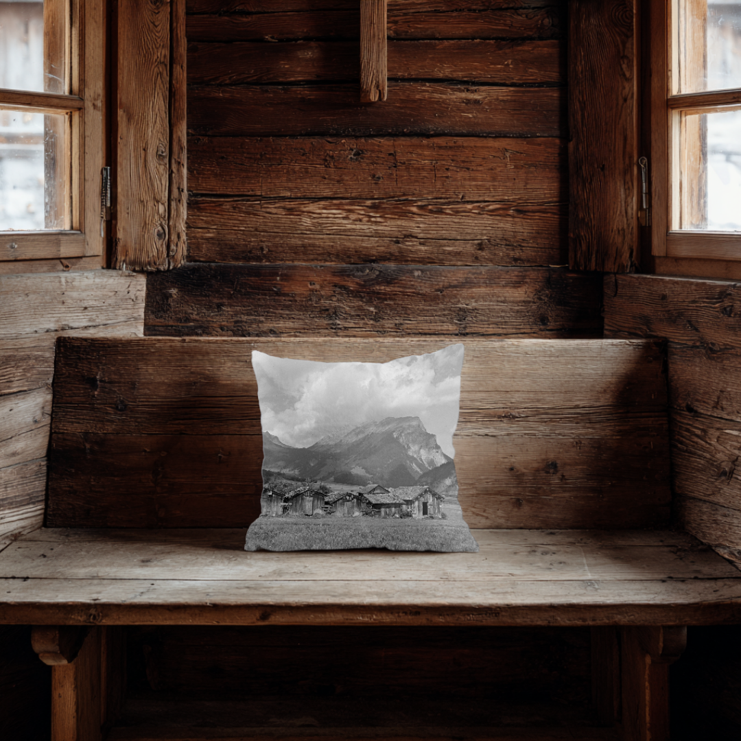 Dieses Kissen zeigt eine Gruppe alter Holzstadeln in Au, direkt vor der eindrucksvollen Kanisfluh. Die klar erkennbare Bergsilhouette und die einfache Struktur der Stadel ergeben ein ruhiges, unverfälschtes Motiv, das den Charakter dieser Gegend sehr gut widerspiegelt. Ein stimmiger Blick auf ein vertrautes Bild aus Au.