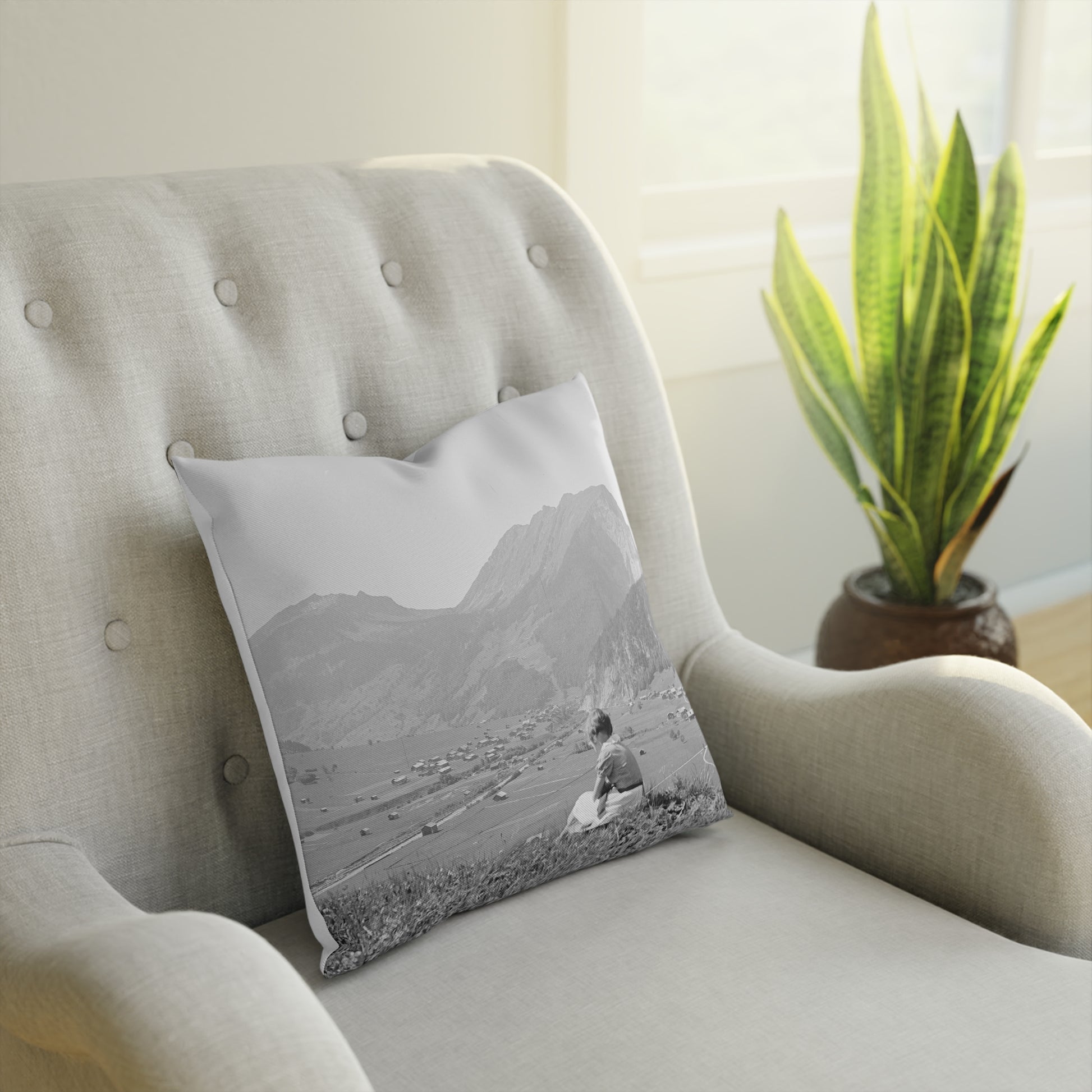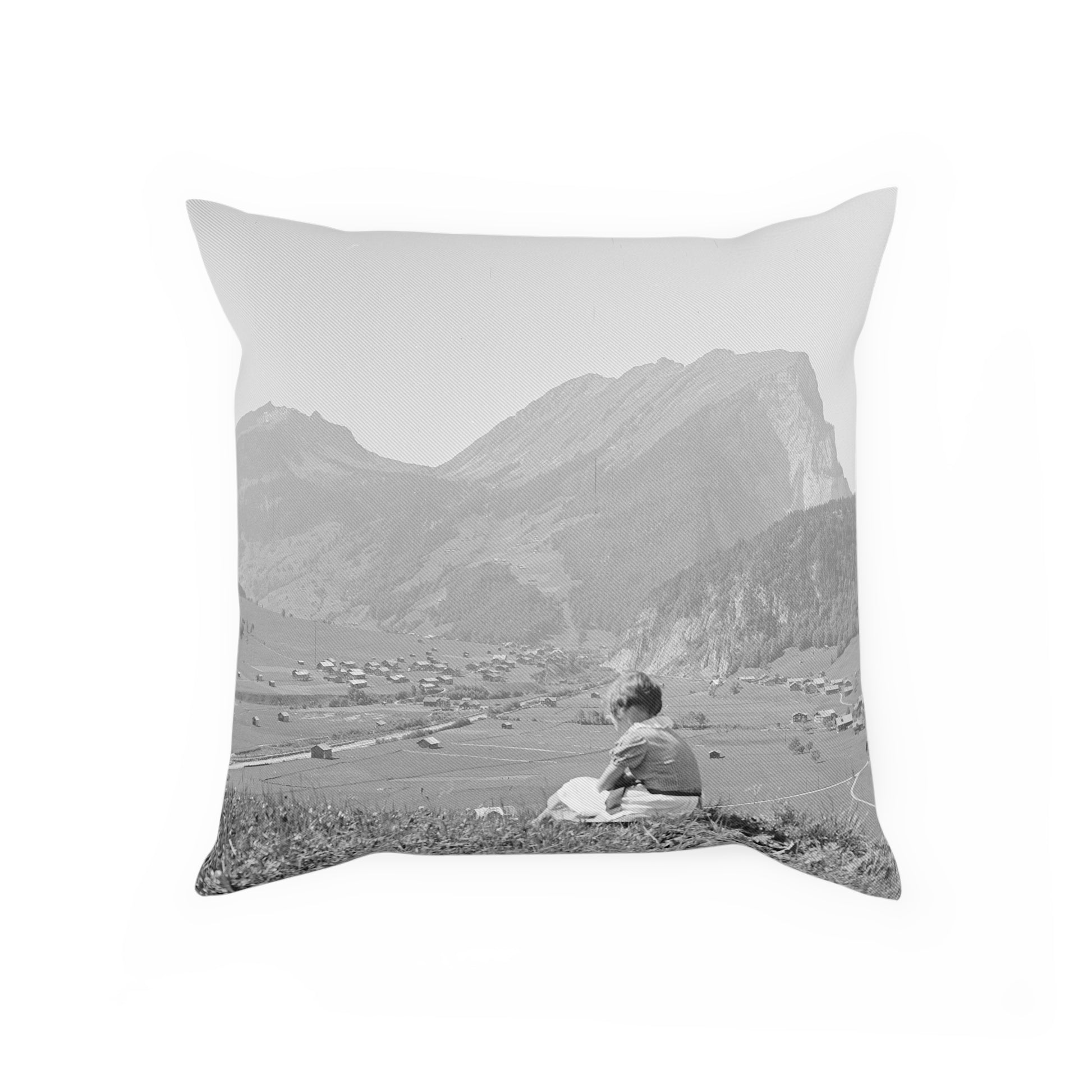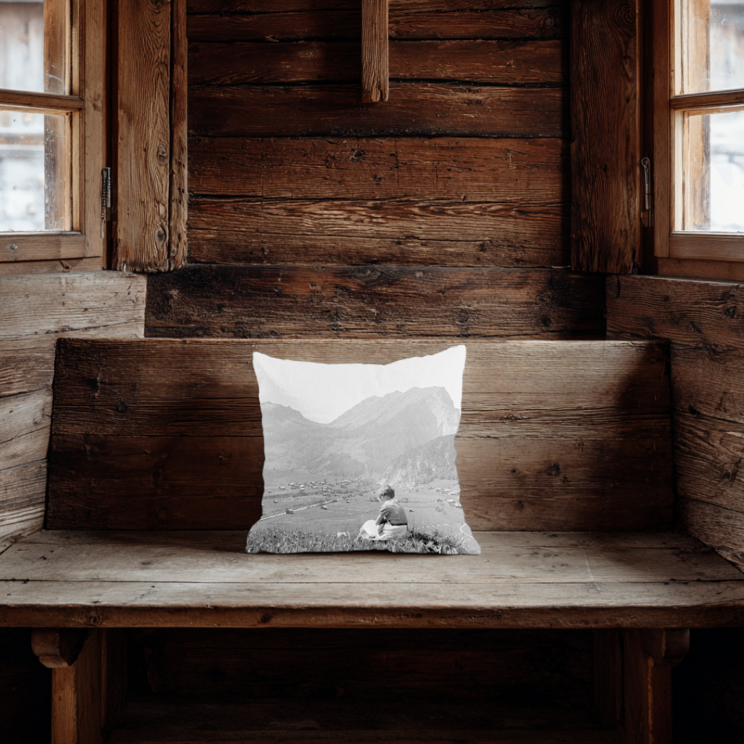 Dieses Kissen zeigt einen klaren Blick über Au-Rehmen mit der Kanisfluh im Hintergrund. Besonders auffällig ist, wie weitläufig und offen der Ort zu dieser Zeit war – nur wenige Häuser stehen im Tal, wodurch der starke Unterschied zu heute deutlich wird. Im Vordergrund sitzt ein Kind am Wiesenhang, was dem Bild eine ruhige, persönliche Stimmung verleiht. Eine Aufnahme, die den ursprünglichen Charakter von Au eindrucksvoll festhält.