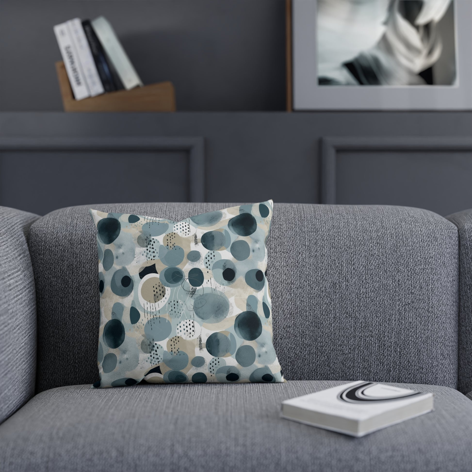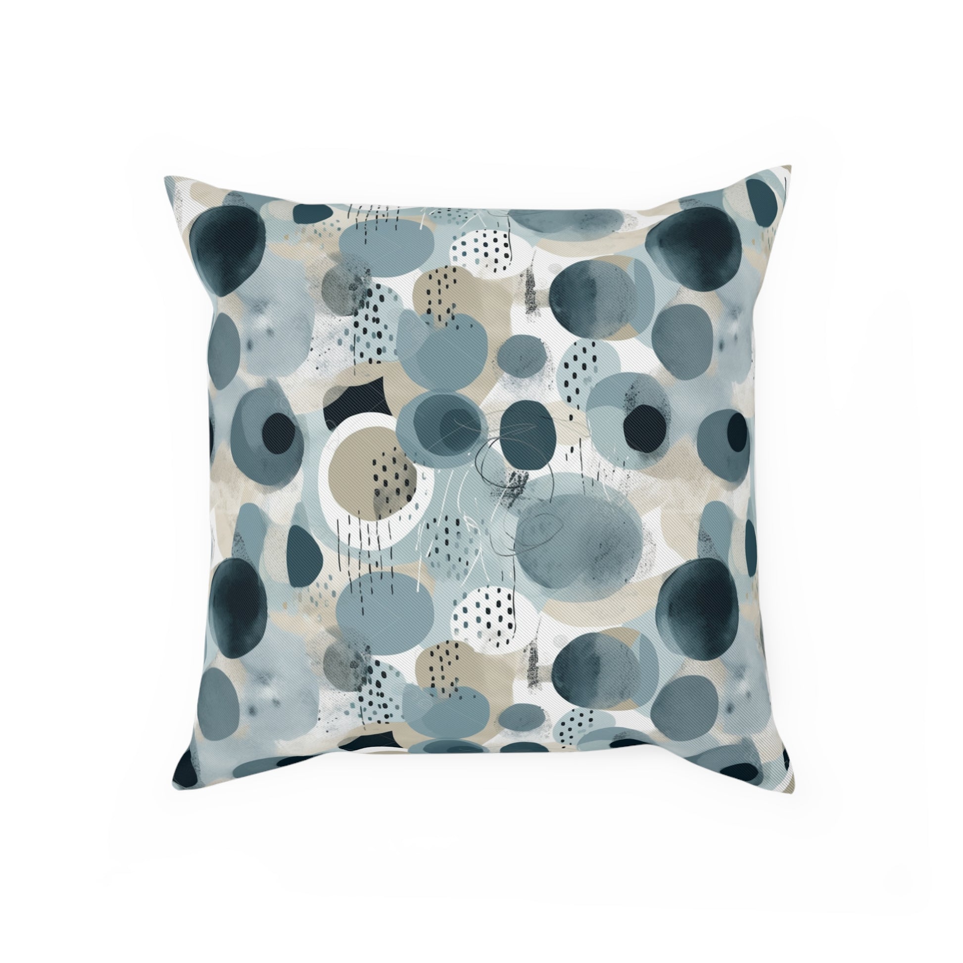 „Dot Cloud“ vereint Ruhe und Ausdruckskraft zugleich. Sanft überlagerte Kreise in Blau, Grau und Taupe schweben über einem neutralen Hintergrund und erzeugen ein aquarellartiges Muster voller Tiefe und Bewegung. Der Mix aus klaren und weichen Kanten verleiht dem Design einen sanften Rhythmus – verspielt und doch minimalistisch.