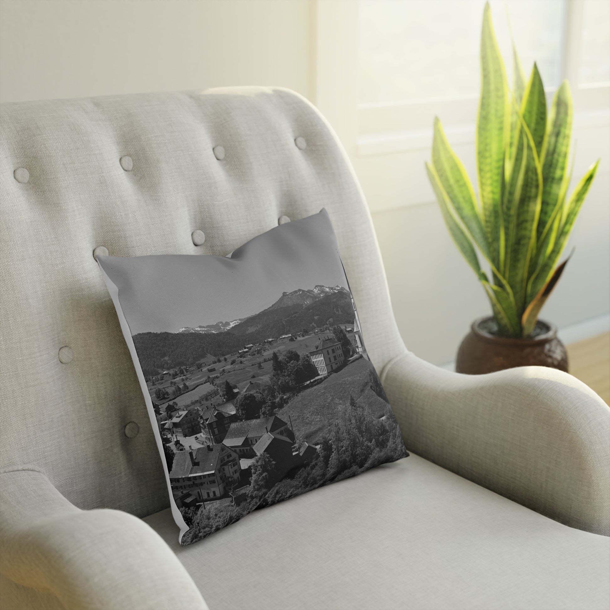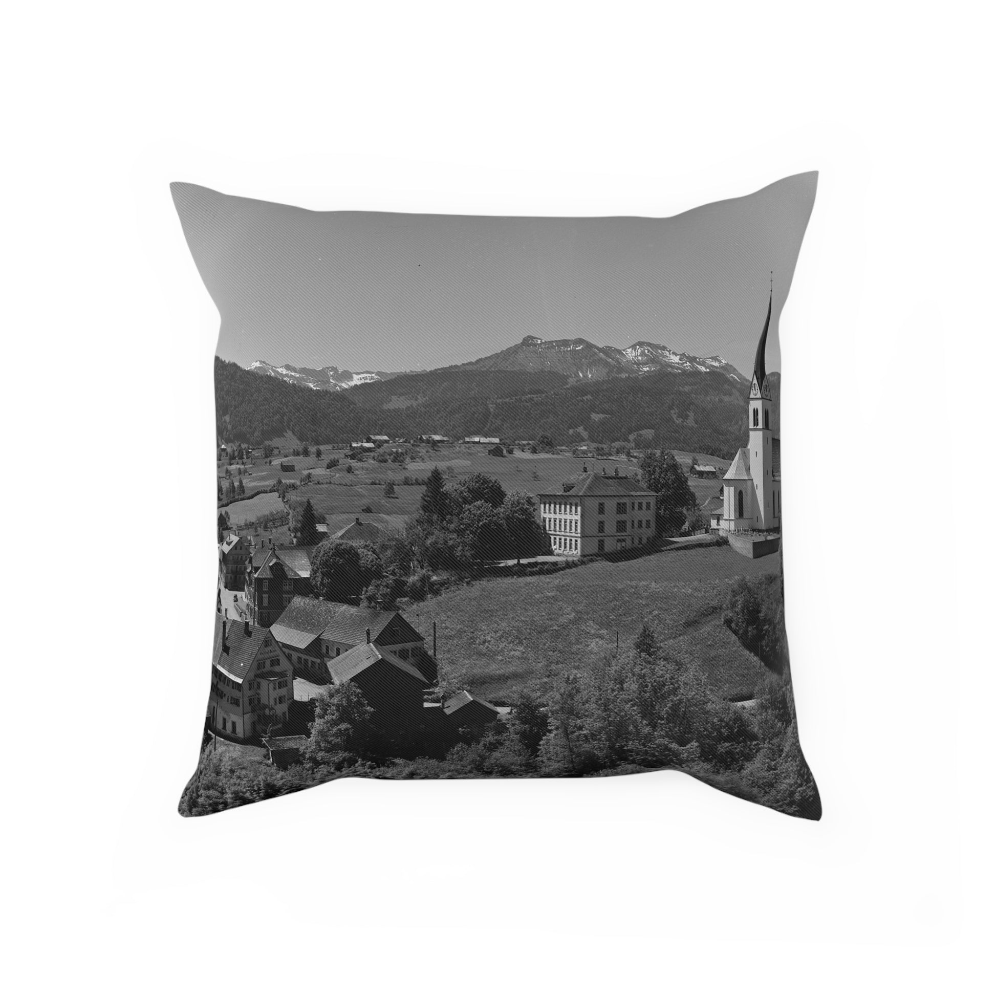Dieses Kissen zeigt Egg mit der Kirche als markantem Mittelpunkt und dem umliegenden Dorf, klar und übersichtlich aus einer erhöhten Position aufgenommen. Die weite Sicht auf die Häusergruppen und die dahinterliegenden Höhenzüge verleiht dem Motiv eine offene, klare Wirkung. Ein ruhiger, authentischer Blick auf den Ort, so wie man ihn kennt.