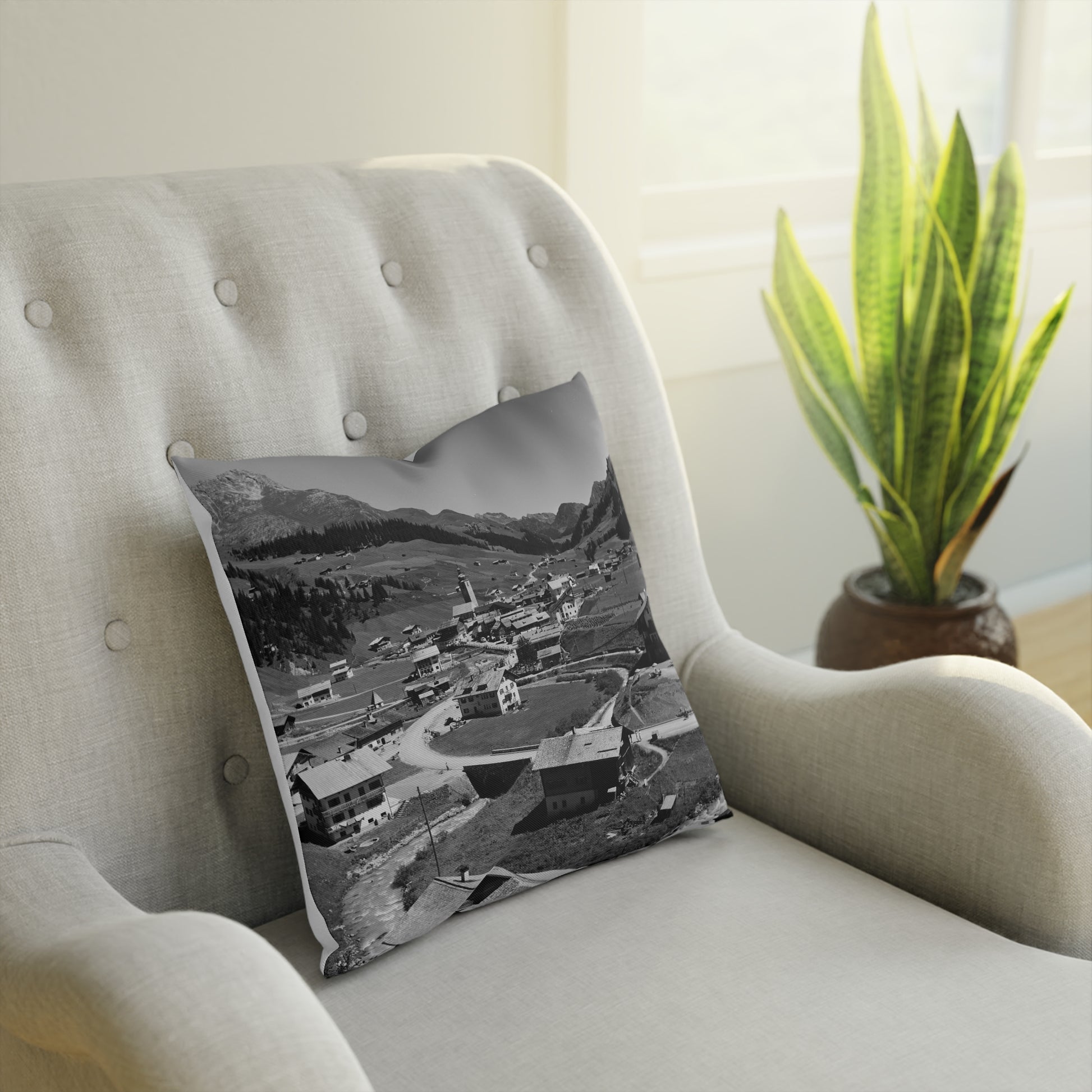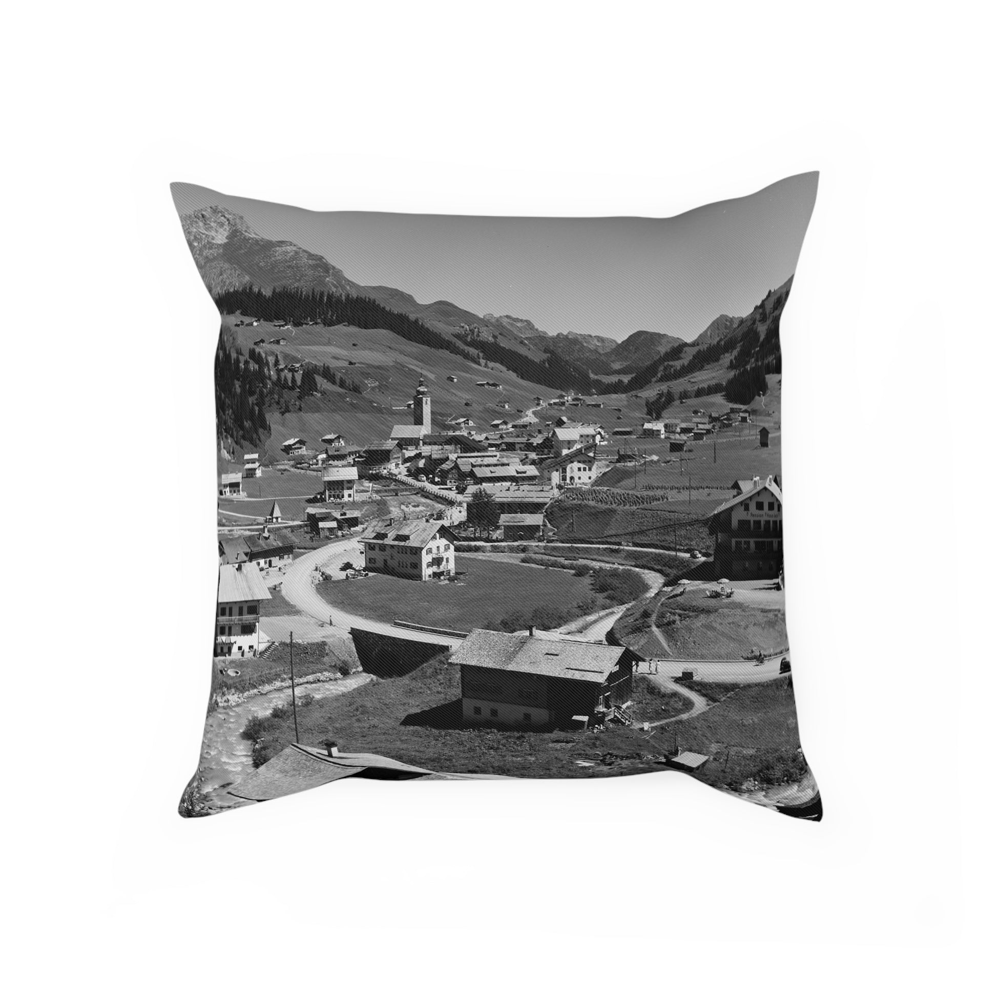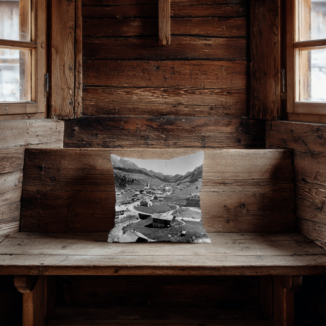 Dieses Kissen zeigt eine weite Ansicht von Lech mit dem Dorfkern, den typischen Gebäuden und dem geschwungenen Verlauf des Bachs, der sich durch das Bild zieht. Die umliegenden Hänge und die markante Bergkulisse geben dem Motiv seine klare, offene Wirkung. Ein ruhiges, stimmiges Design, das den Charakter des Ortes zeitlos festhält.