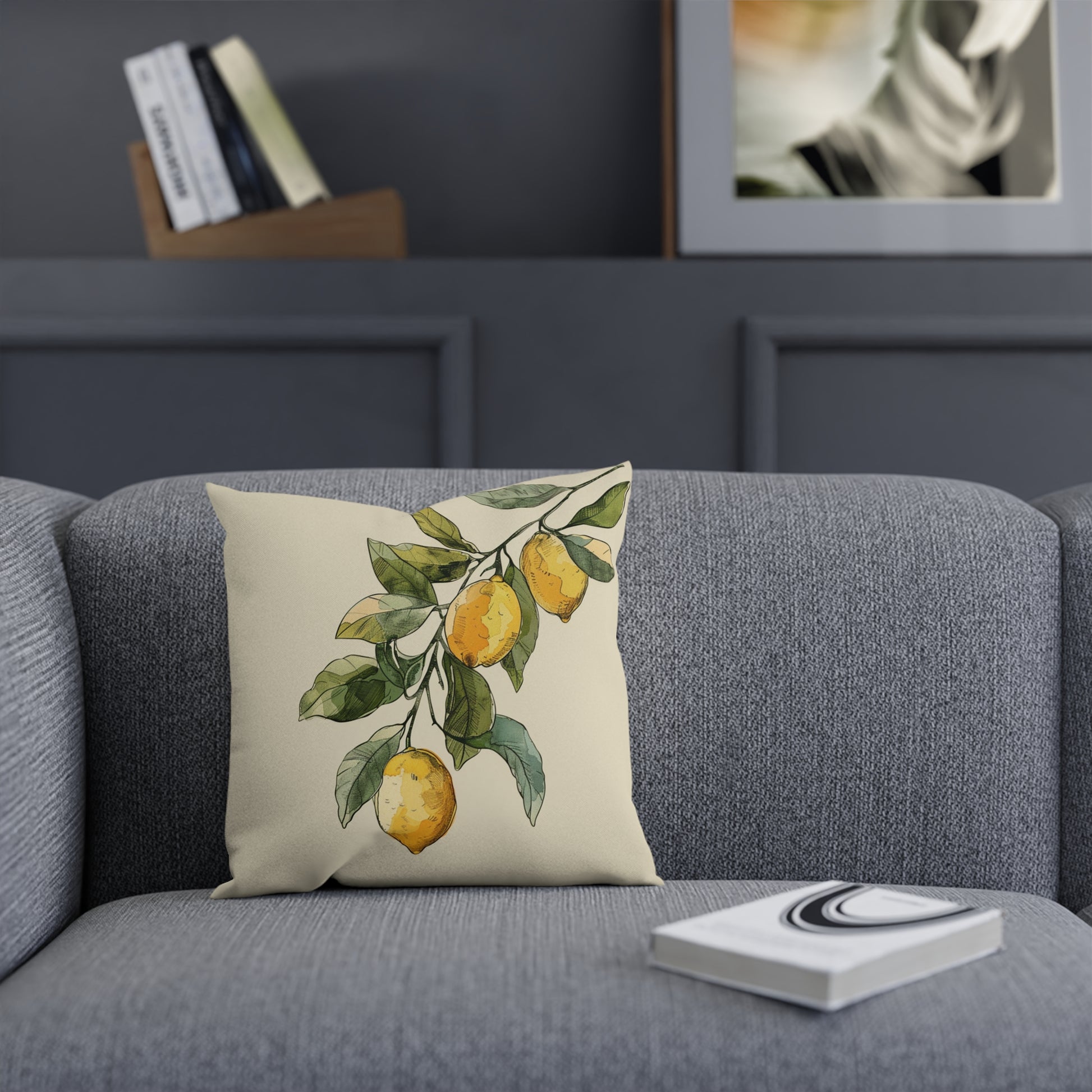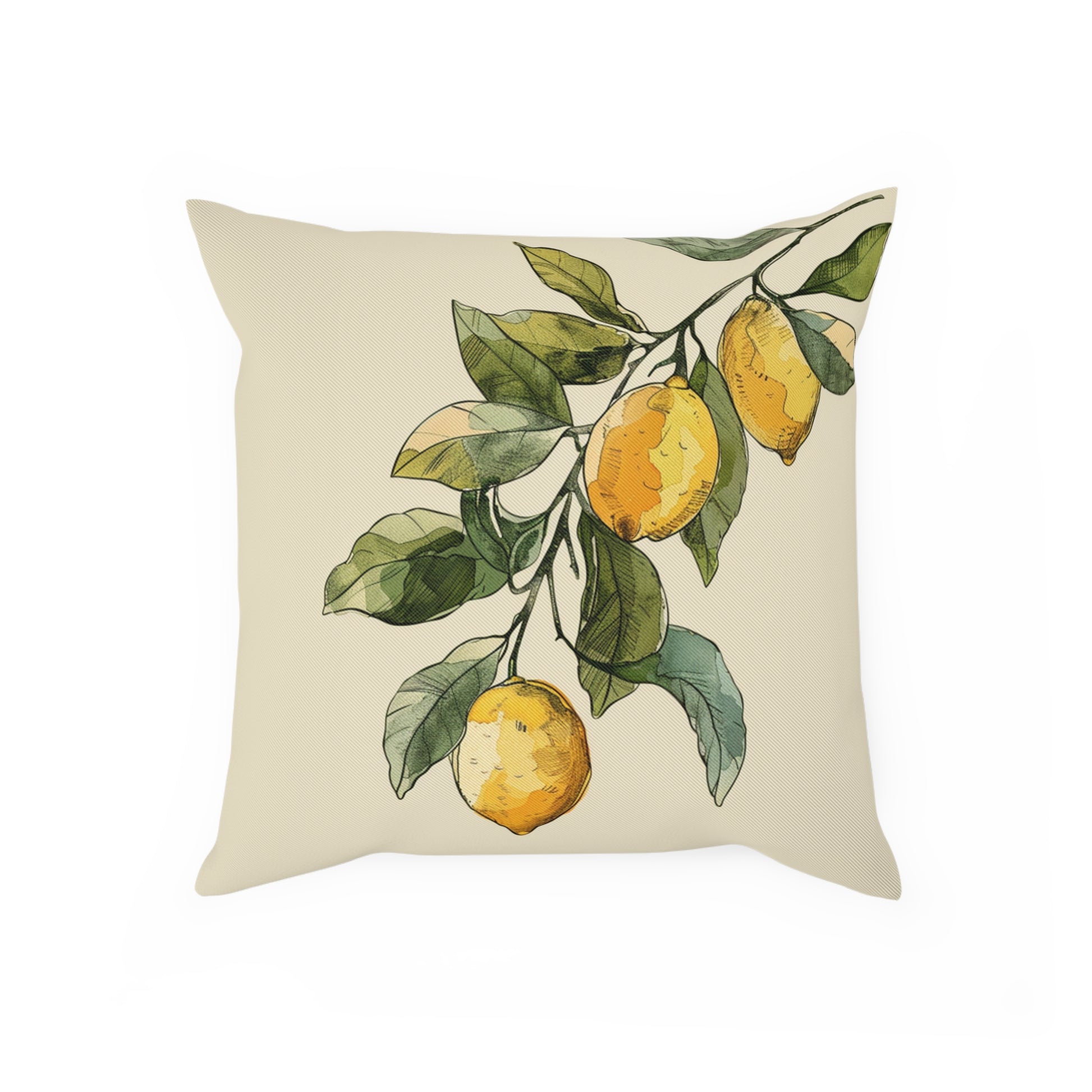 Hol dir mediterranes Flair nach Hause – „Lemon Branch“ zeigt kräftig grüne Blätter und leuchtende Zitronen auf einem weichen Beigeton. Dieses Design bringt frische Farbe und natürliche Leichtigkeit in jeden Raum. Ob auf dem Sofa, im Schlafzimmer oder draußen auf der Terrasse – dieses Kissen wirkt das ganze Jahr über stilvoll und einladend.