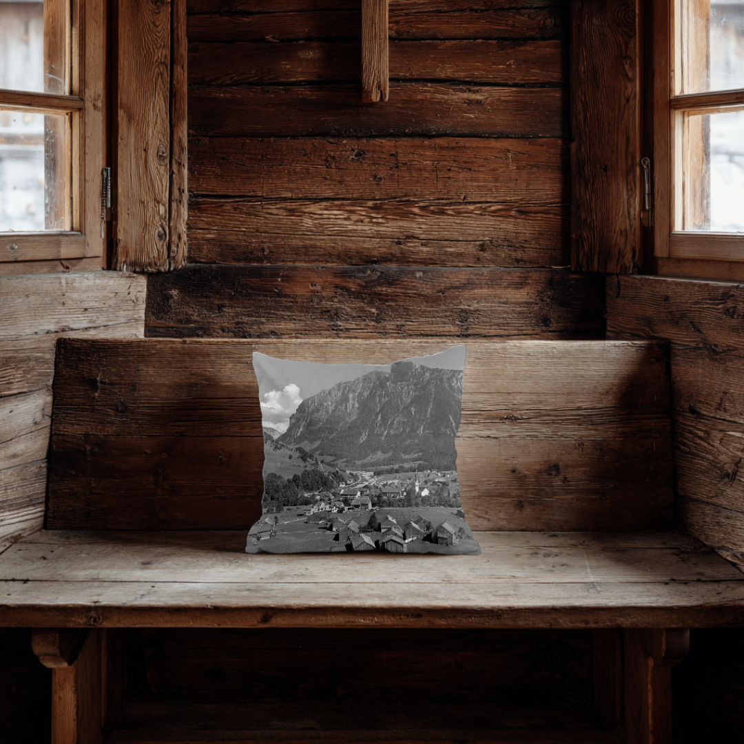Dieses Kissen zeigt Mellau mit einem klaren Blick über das gesamte Dorfzentrum und die Bregenzerache, die sich gut sichtbar durch das Bild zieht. Auffallend ist, wie weitläufig der Ort wirkt – im Vergleich zu heute stehen deutlich weniger Häuser, was einen guten Eindruck davon gibt, wie offen Mellau früher war. Die markante Bergkulisse im Hintergrund rundet die Aufnahme ab und macht sie zu einem ruhigen, eindrucksvollen Zeitbild.