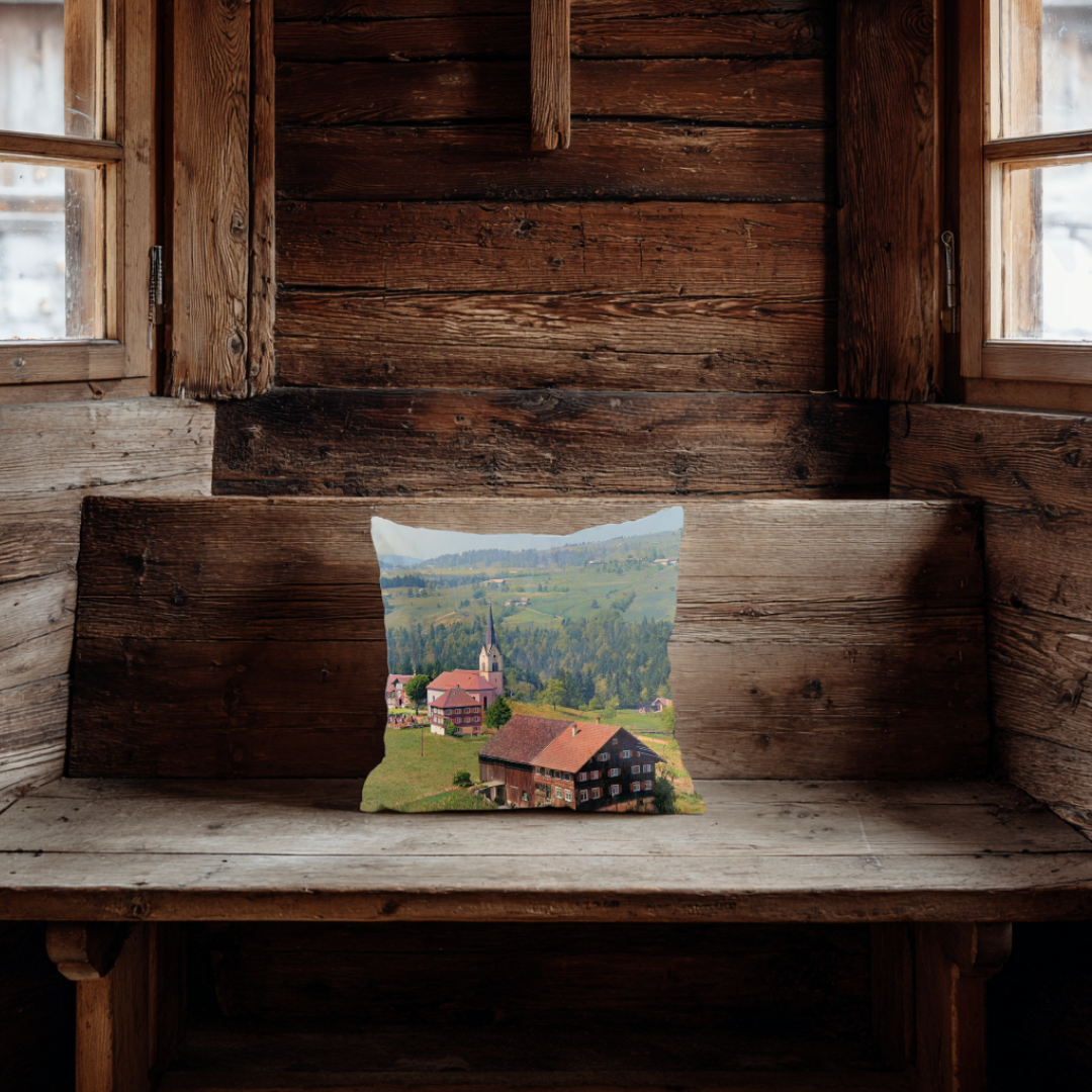Dieses Kissen zeigt einen weiten Blick über Müselbach mit der Kirche im Zentrum und dem Dorf, das sich harmonisch in die umgebenden Hügel und Wälder einbettet. Die erhöhte Perspektive eröffnet eine klare Sicht über den Vorderwald und lässt die Landschaft offen und weit wirken. Ein ruhiges, authentisches Motiv, das die besondere Lage und Stimmung des Ortes stimmungsvoll einfängt.