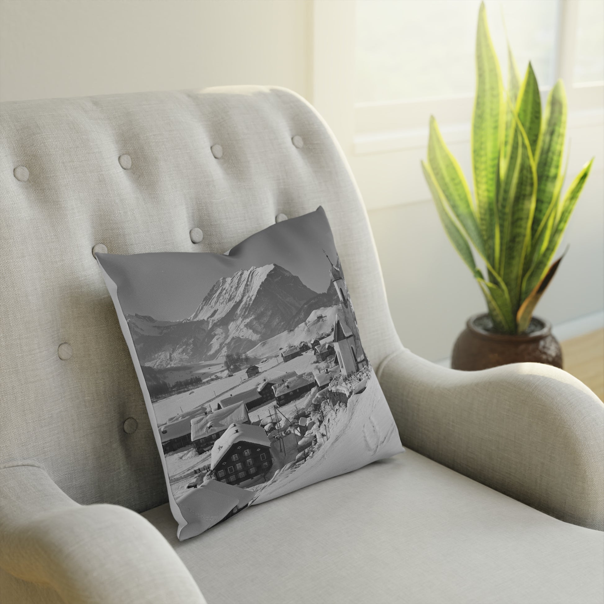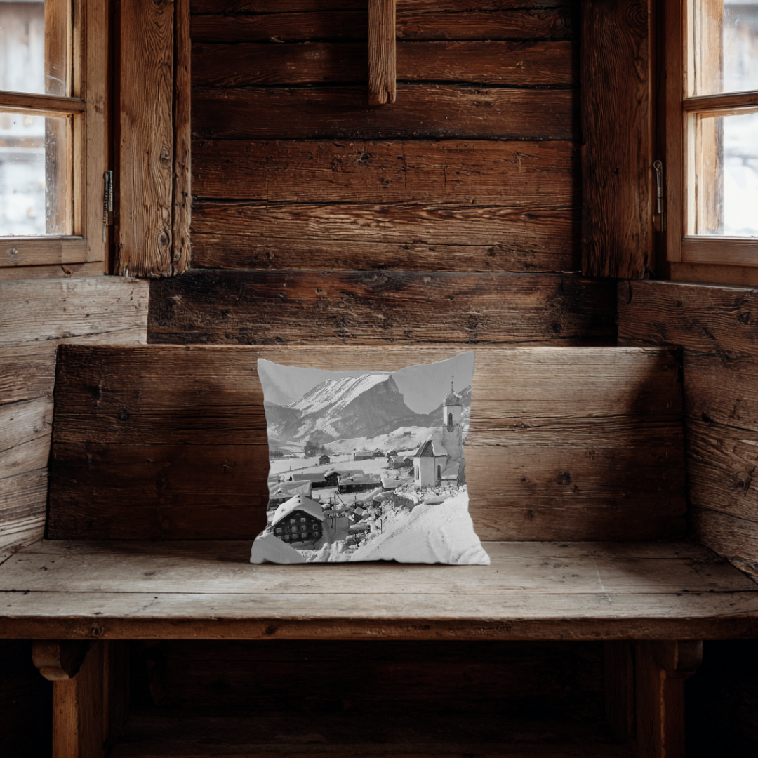 Dieses Kissen zeigt eine ruhige Winteransicht von Schoppernau mit der markanten Kirche im Vordergrund und den umliegenden traditionellen Häusern, eingebettet in eine weite, verschneite Landschaft. Die erhöhte Perspektive bietet einen klaren Blick über das Dorf und die umliegenden Hänge, wodurch eine harmonische, stille Atmosphäre entsteht, die alpine Ruhe und regionale Verbundenheit widerspiegelt.
