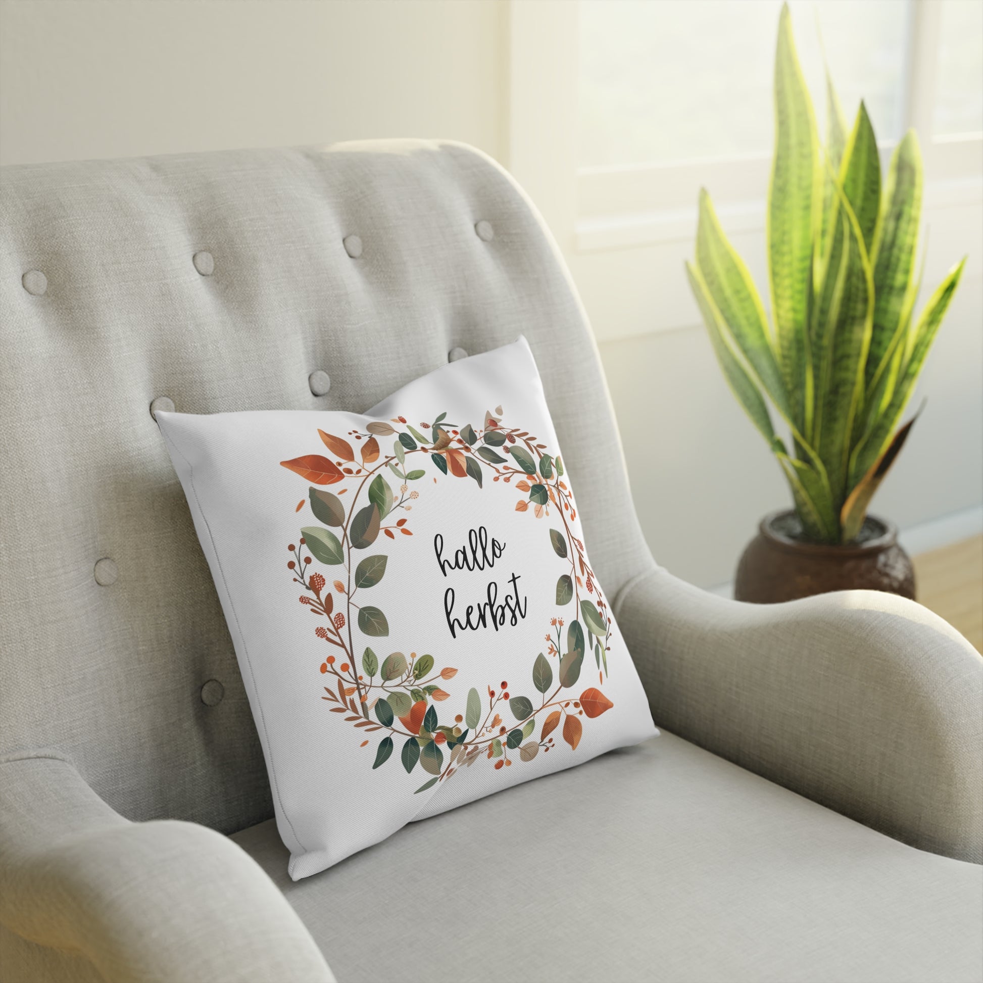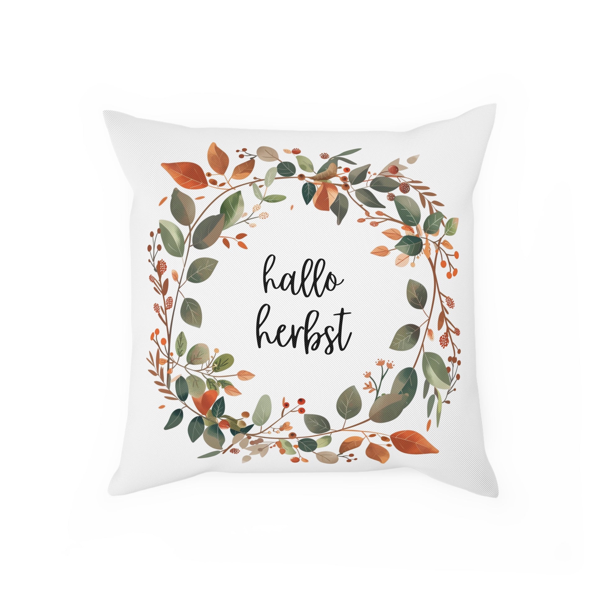 Ein herbstlicher Blätterkranz in warmen Grün- und Orangetönen umrahmt den Schriftzug „hallo herbst“ und macht dieses Kissen zu einem charmanten Eyecatcher für die goldene Jahreszeit. Ob im Wohnzimmer, im Eingangsbereich oder als saisonale Dekoration im Schlafzimmer – „Autumn Wreath“ bringt sofort Gemütlichkeit und Farbe in dein Zuhause.