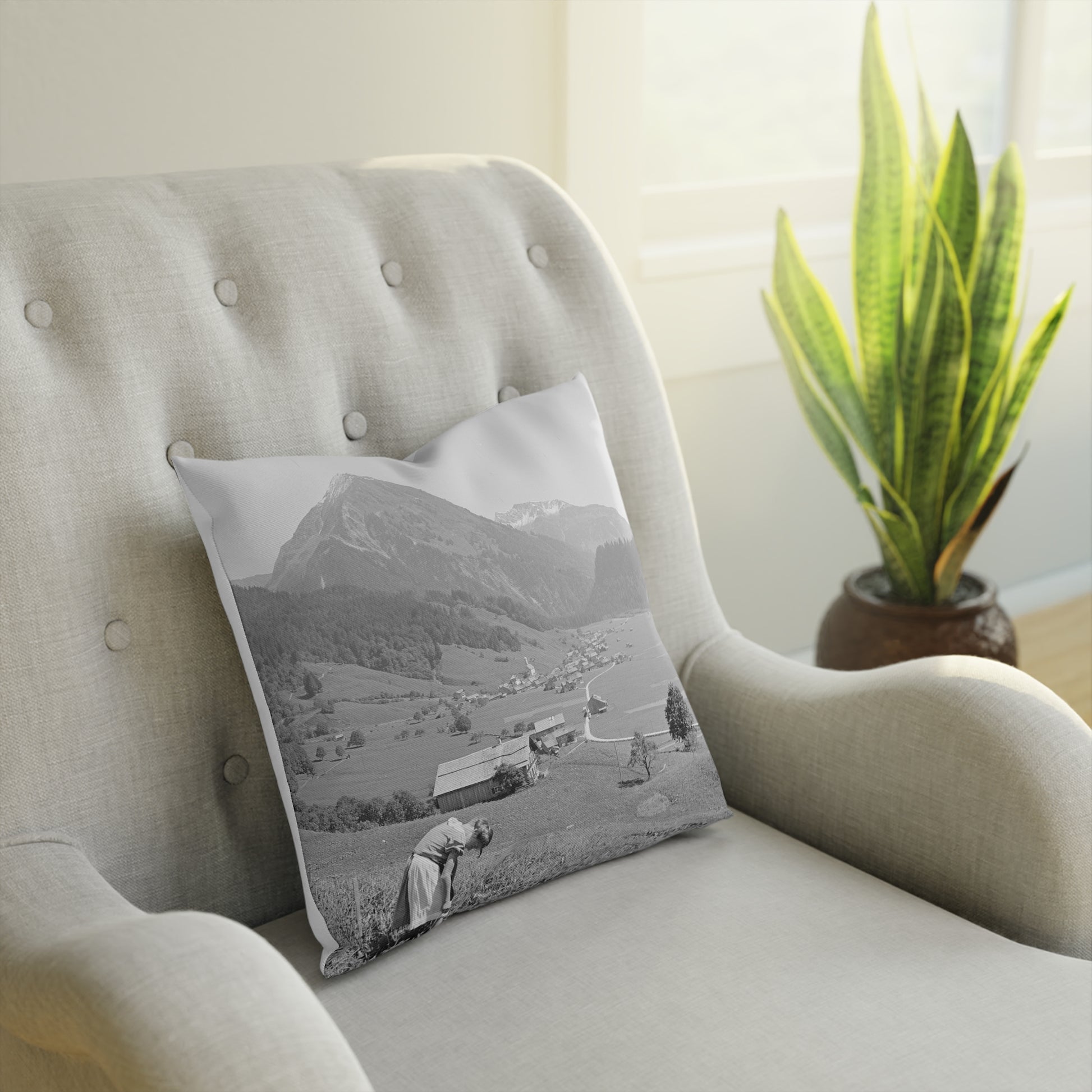 Dieses Kissen zeigt einen offenen Blick über Schoppernau in einer Zeit, in der das Dorf noch deutlich weniger verbaut war. Die weiten Flächen, die wenigen Häuser und die klar sichtbaren Wege lassen den großen Unterschied zu heute erkennen. Im Vordergrund steht ein Kind auf einer Wiese, was der Aufnahme eine natürliche, alltägliche Note verleiht. Ein ruhiges Motiv, das die alte Struktur von Schoppernau eindrücklich festhält.