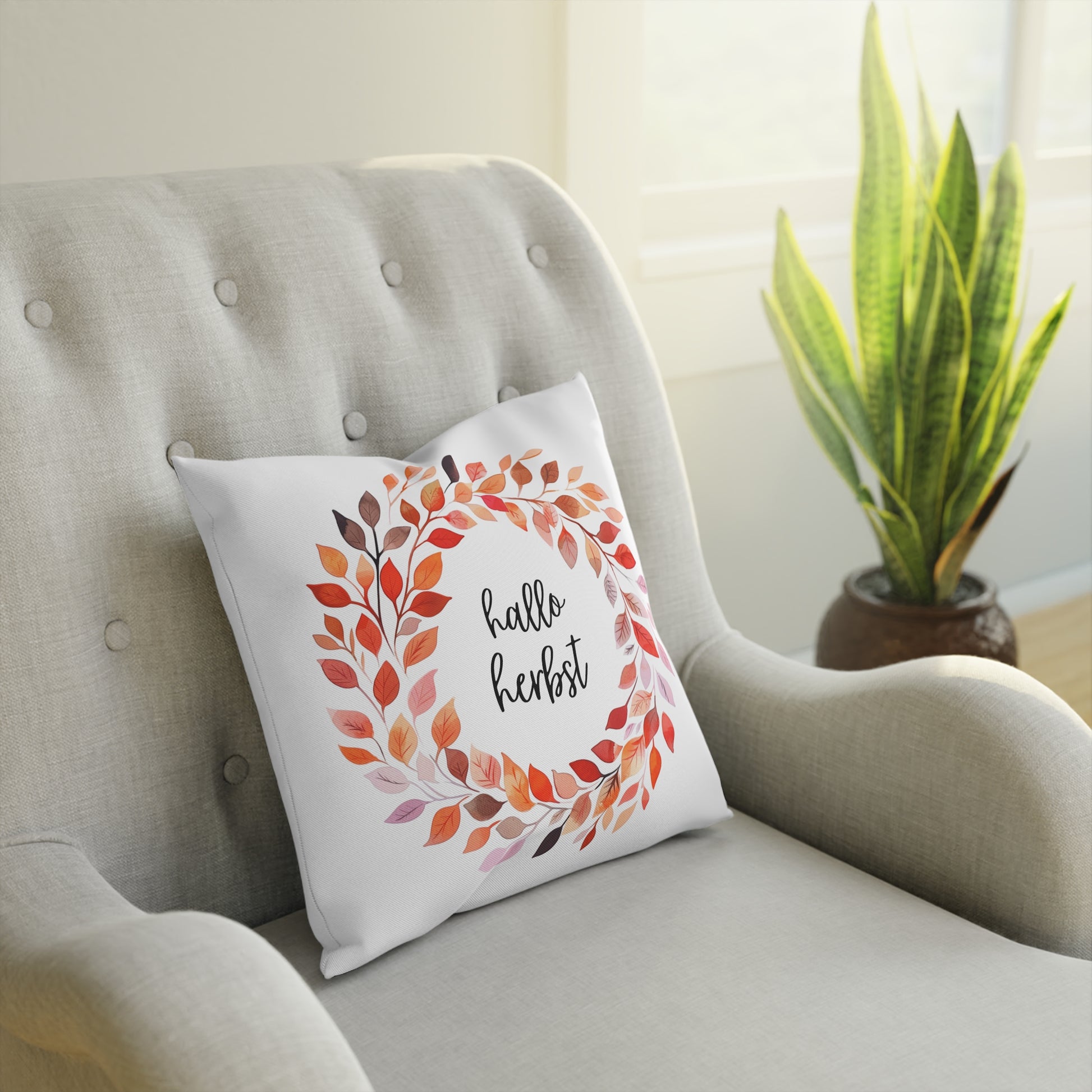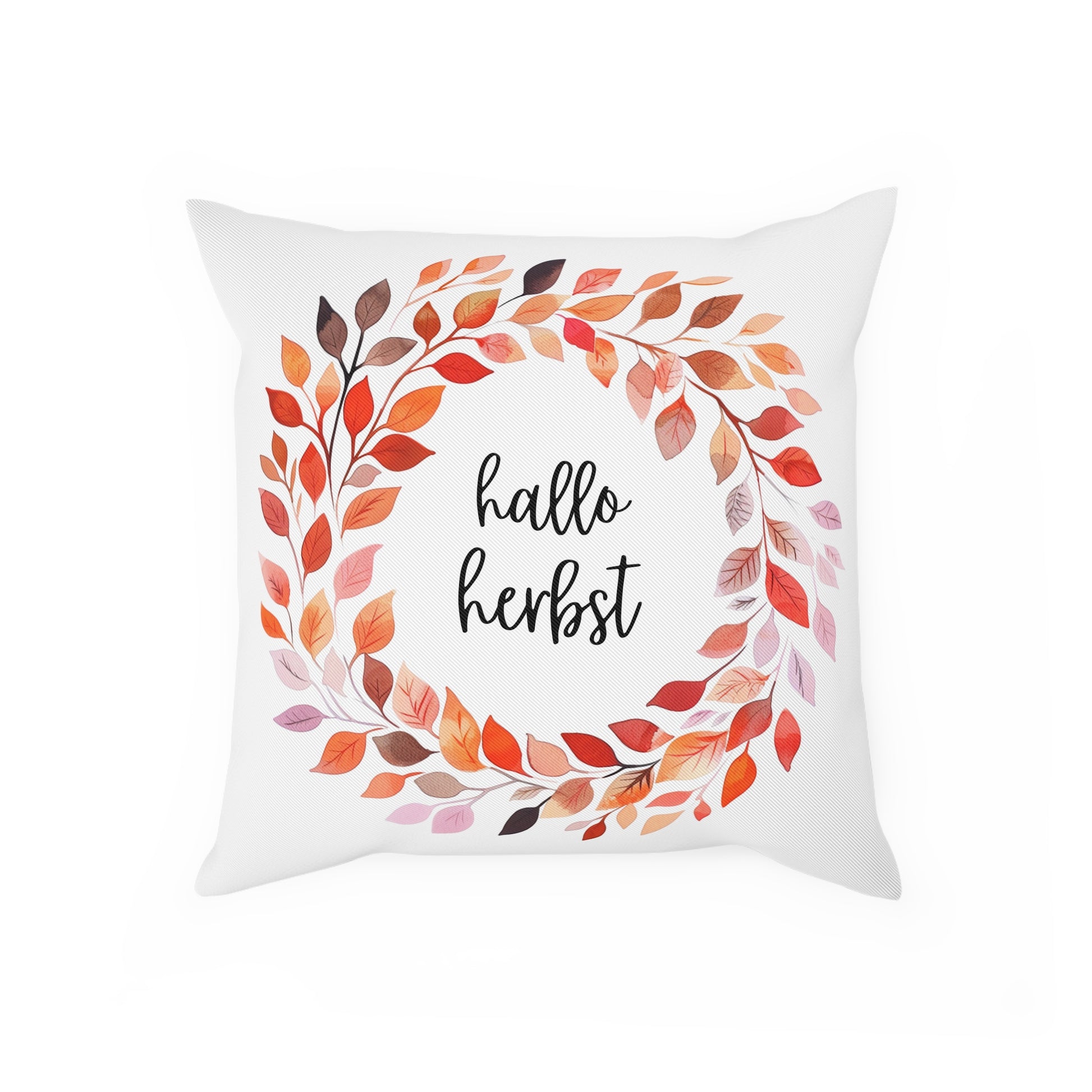 Ein strahlender Blätterkranz in leuchtenden Orange-, Rot- und Rosatönen umrahmt den Schriftzug „hallo herbst“. Dieses Kissen bringt die ganze Farbvielfalt des Herbstes in dein Zuhause – lebendig, warm und voller Charme. Ideal für gemütliche Sofaecken, saisonale Deko im Eingangsbereich oder als stimmungsvoller Akzent im Schlafzimmer.