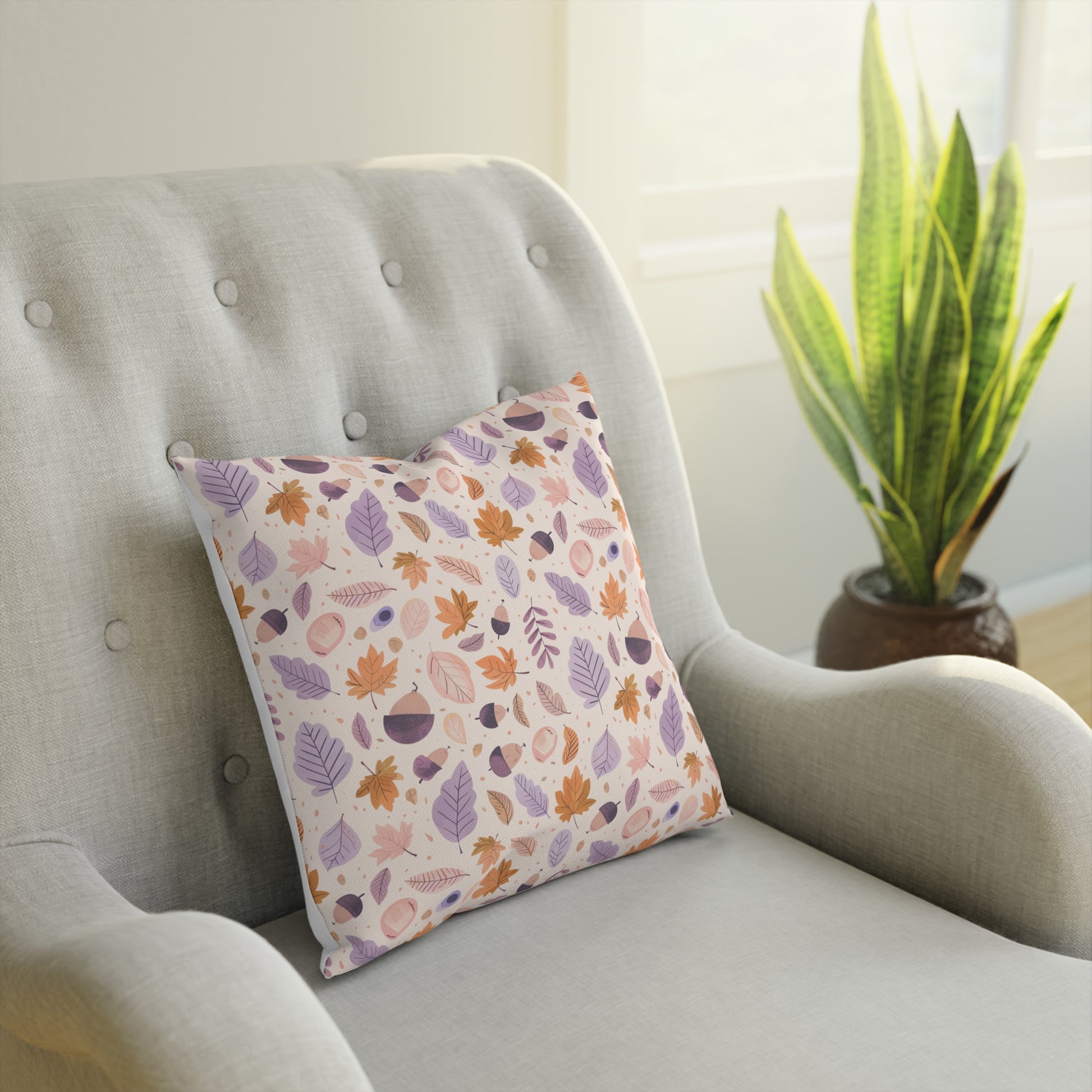 Ein verspieltes Blättermuster in sanften Violett- und Orangetönen bringt Leichtigkeit und Farbe in dein Zuhause. Mit seinen feinen Details aus Blättern, Eicheln und Beeren ist „Leaf Harmony“ ein fröhlicher Akzent, der moderne und gemütliche Räume gleichermaßen bereichert. Perfekt für Sofa, Leseecke oder als saisonales Highlight im Herbst.