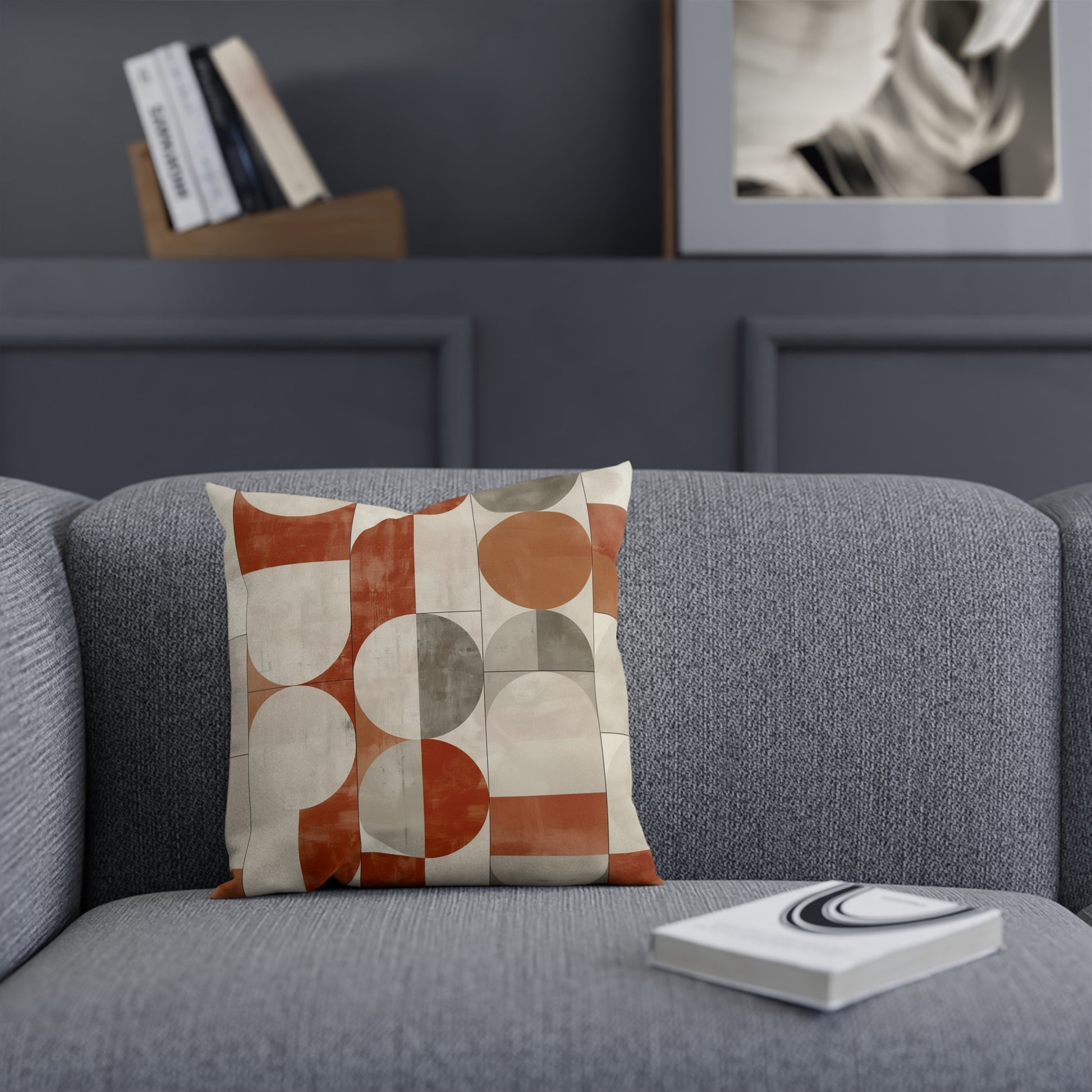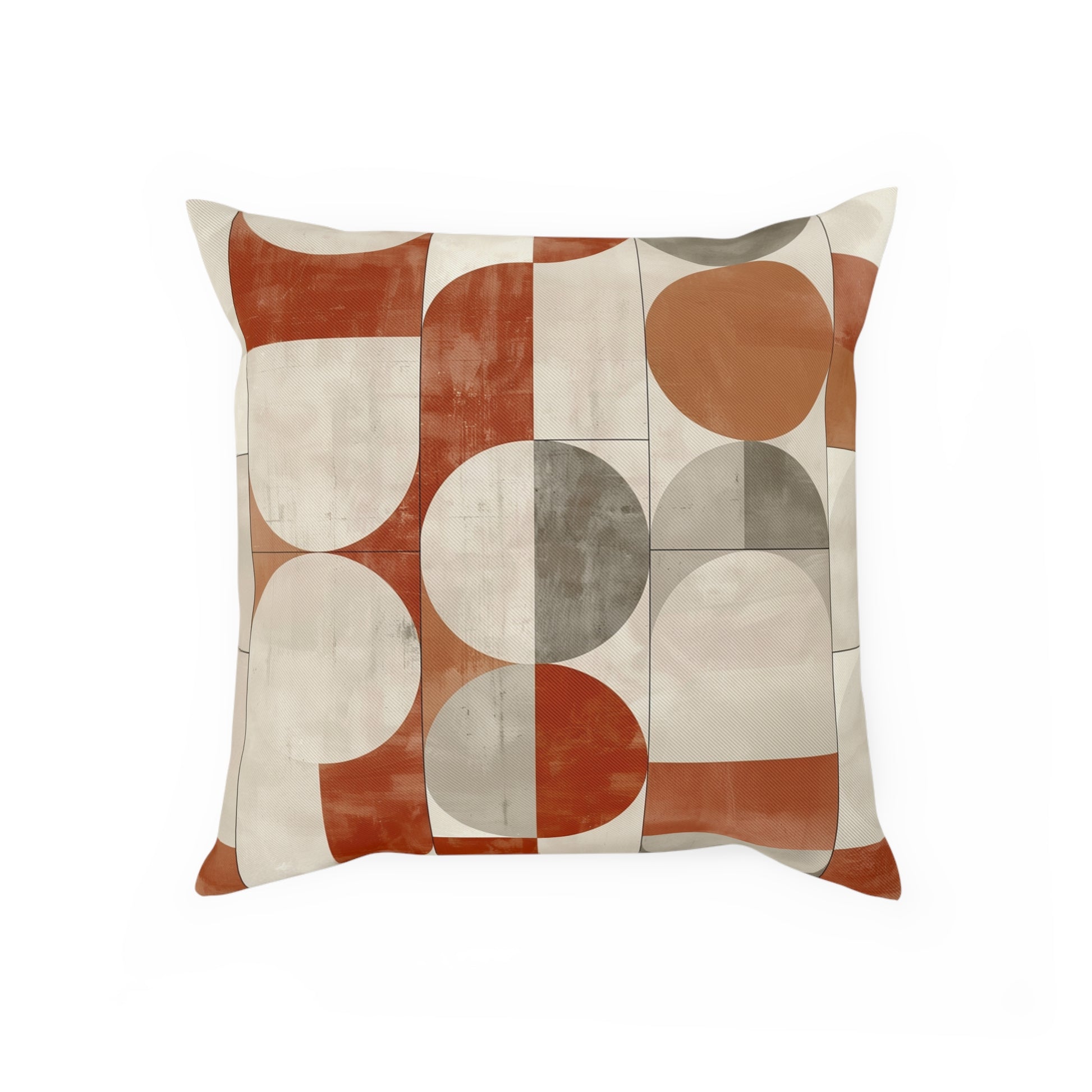Gedämpfte Symmetrie trifft auf kraftvolle Wärme: „Terracotta Grid“ verbindet organische Kurven mit klaren Linien und schafft so ein spannendes Spiel aus Struktur und Harmonie. Erdiges Orange, sanftes Beige und kühles Grau machen dieses Kissen zu einem ausdrucksstarken Highlight – perfekt für Mid-Century- oder moderne Interiors mit Charakter.